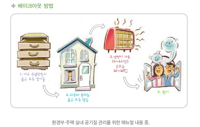 - 베이크 아웃 : 베이크 아웃은 실내 온도를 높여 유해물질을 나오게 만드는 방법입니다. 이는 이사 전에 바로 하는 것이 좋습니다. 예를 들어 난방은 35도에서 40도로 하고 하루에 10시간 유지한 다음, 1~2시간 창문을 열어 환기시키며 이 과정을 5회 정도 하시면 됩니다.