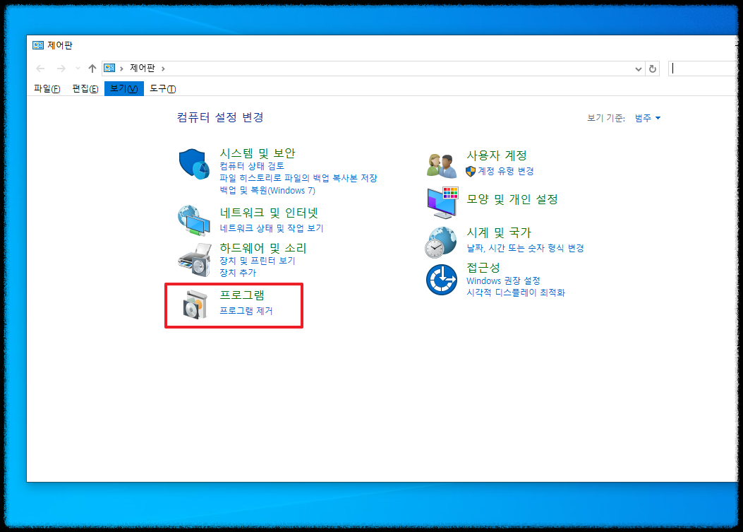 먼저 시작 옆에 돋보기 검색란에 제어판을 치면 컴퓨터 설정 변경이 나옵니다. 그중 시스템 및 보안, 네트워크 및 인터넷, 하드웨어 및 소리, 프로그램, 사용자 계정, 모양 및 개인 설정, 시계 및 국가, 접근성 등이 있습니다. 그중 프로그램에서 프로그램 제거를 누르면 됩니다.