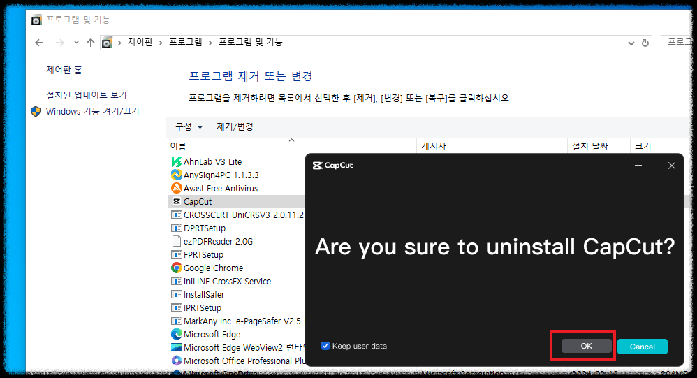 제거/변경을 누르면 'are you sure to uninstall CapCut?'라고 삭제할 것인지 다시한번 물어보면 'ok'를 누르면 됩니다. 누르면 캡컷 프로그램이 삭제됩니다.