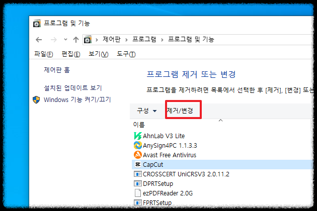 프로그램 제거 또는 변경을 누르면 수많은 프로그램이 나올 것입니다. 그중 원하지 않는 프로그램을 선택하여 삭제하면 됩니다. 저는 캡컷이라는 동영상 만드는 프로그램을 삭제하겠습니다. 선택을 하면 구성 옆에 제거/변경이 보입니다.